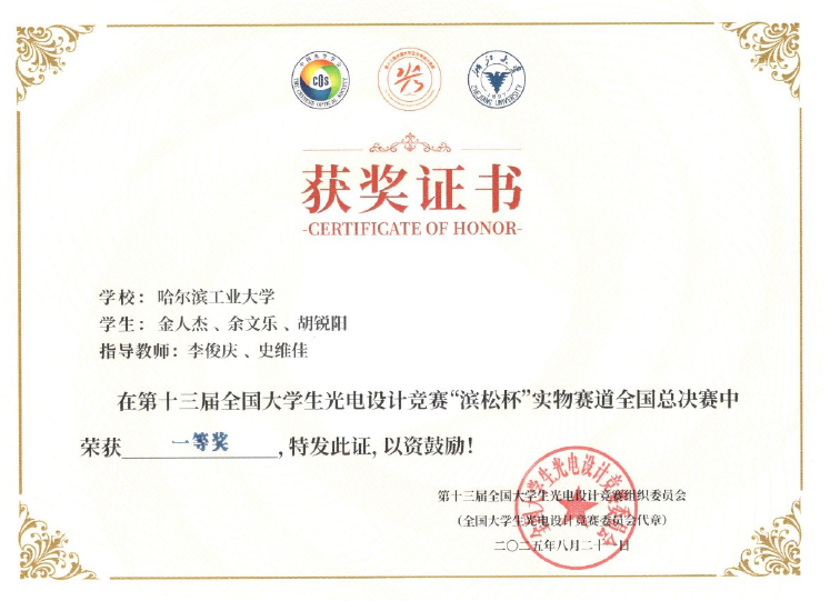 8月22日,在杭州举办的第十三届全国老员工光电设计竞赛“滨松杯”实物赛道全国总决赛中,beats365亚洲版官网“追光逐电”队成员金人杰、余文乐、胡锐阳在第二赛题中获得一等奖。该队为一校三区所有参赛队伍中唯一获得该奖项的队伍。beats365亚洲版官网李俊庆教授作为第一指导教师、仪器公司史维佳教授作为第二指导教师,二人均被评为全国优秀指导教师。