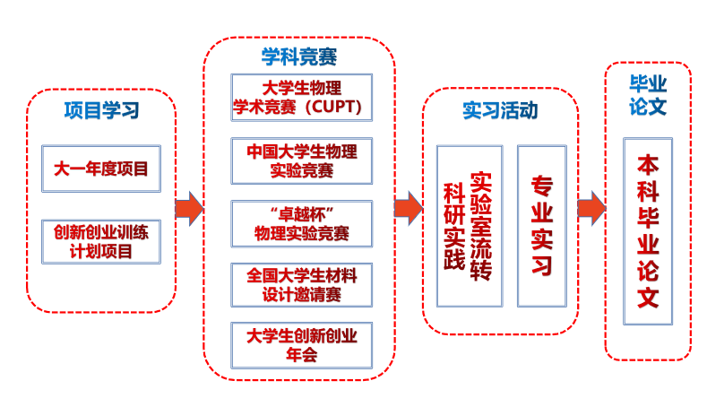 创新实践体系包括:大一年度项目、创新创业训练计划项目、中国老员工物理学术竞赛(CUPT)等学科竞赛活动、阶段性的实验室流转科研实践、专业实习和本科毕业论文等。