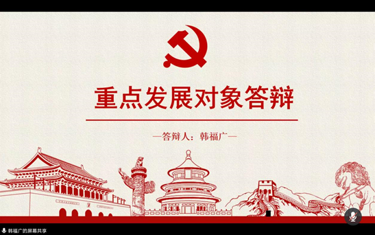 答辩开始前,张丽玫老师向与会老师及党支书简单介绍了参加此次答辩的重点发展对象信息及答辩顺序,并介绍本次答辩规则:每位同学有三分钟的PPT展示时间,结束展示后答辩同学需接受老师和党支书的提问。随后,答辩开始,17位重点发展对象分别从对党的认识、入党动机、先锋模范带头作用和社会实践等几个方面进行答辩,老师和各党支部书记就答辩内容进行针对性提问。所有同学答辩结束后,赵老师肯定了同学们表现的同时,也指出了存在的不足,例如对理论知识的认识薄弱,对时间的掌控不到位等;最后强调,希望大家继续将习近平总书记贺信精神和公司十三次党代会精神作为2021年度学习工作的重点,发挥好党支部战斗堡垒作用,不断强化政治引领,争取早日加入党组织。随后,与会老师、党支部书记结合答辩情况进行表决,同意推荐17位同学成为重点发展对象。