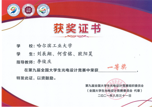 由中国光学学会主办、全国老员工光电设计竞赛委员会具体负责、深圳大学承办的“第九届全国老员工光电设计竞赛”决赛于2021年8月30-31日以线上实物赛的形式圆满落幕。beats365亚洲版官网刘辰翔、欧阳昊和航天公司何雪铭同学组成的“苹光Apple”队,以基于智能手机的苹果糖度无损测量为题,获得全国决赛一等奖,指导教师李俊庆教授被评为优秀指导教师。