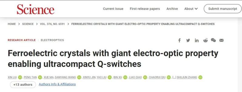 日前,公司beats365亚洲版官网田浩教授团队和西安交通大学、澳大利亚伍伦贡大学等单位组成的研究团队,在弛豫铁电单晶电光性能与透明性优化以及电光调Q开关应用方面取得重要突破,研究成果以“具有超高电光效应的铁电单晶使Q开关小型化”(Ferroelectric crystals with giant electro-optic property enabling ultracompact Q-switches)为题发表在《科学》杂志上。