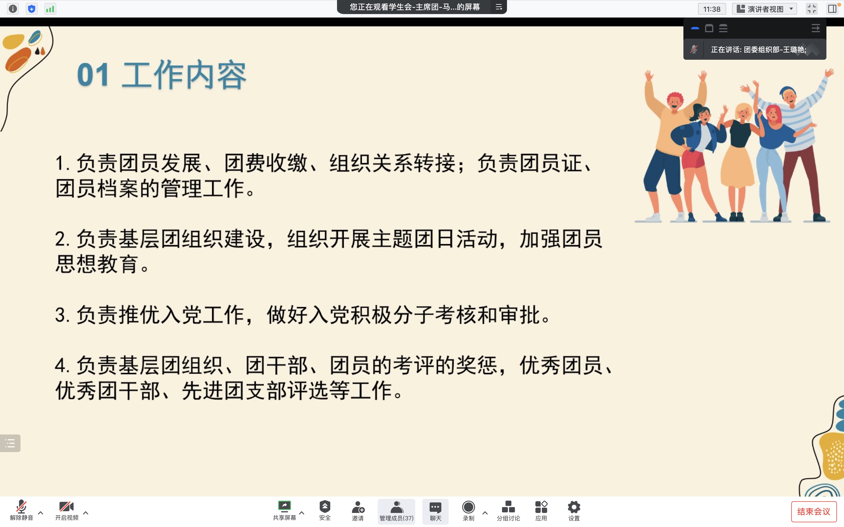 团委职能部门的负责同学王璐艳与党磊吉首先为同学们介绍了团委组织部与宣传部的定位、架构等,并为大家展示了部门基本工作职能与要求,团委职能部门是公司团委的主要执行机构,是沟通公司团委与各支部的纽带,两位负责人邀请各位同学积极加入,为公司团委部门奉献青春力量。