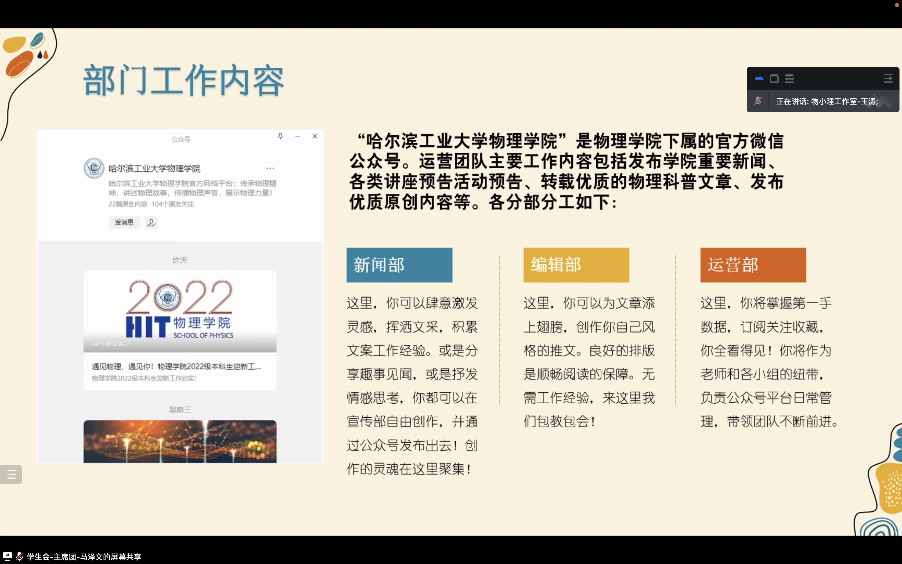 首先,杨承熹老师给同学们介绍了团学组织的基本构成,并说明了参与团学组织的基本流程与要求。接下来,各部门负责人图文并茂的依次介绍了自己部门的工作职责、工作经历及荣誉,以及部门招新要求。