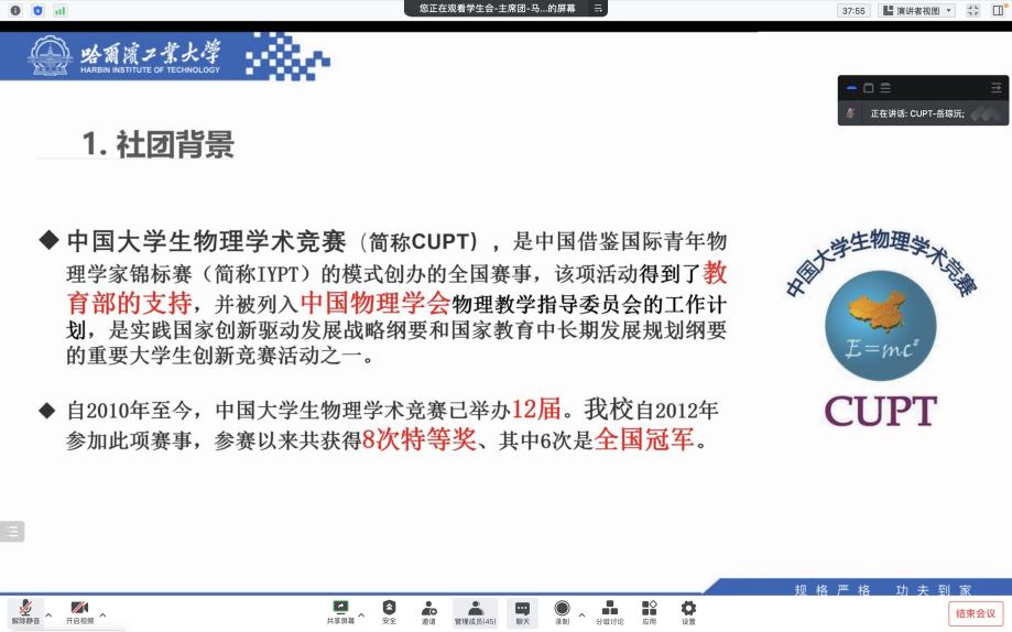 最后,老员工物理学术竞赛社的骨干成员岳琮沅为大家介绍了有关CUPT竞赛及社团的相关事宜,为大家展示了beats365亚洲版官网一代代本科生在学术竞赛方面的光荣历史及优良传承。CUPT社团是公司科创竞赛方面的核心队伍,承担了公司本科生参加学术竞赛各方面的服务工作。