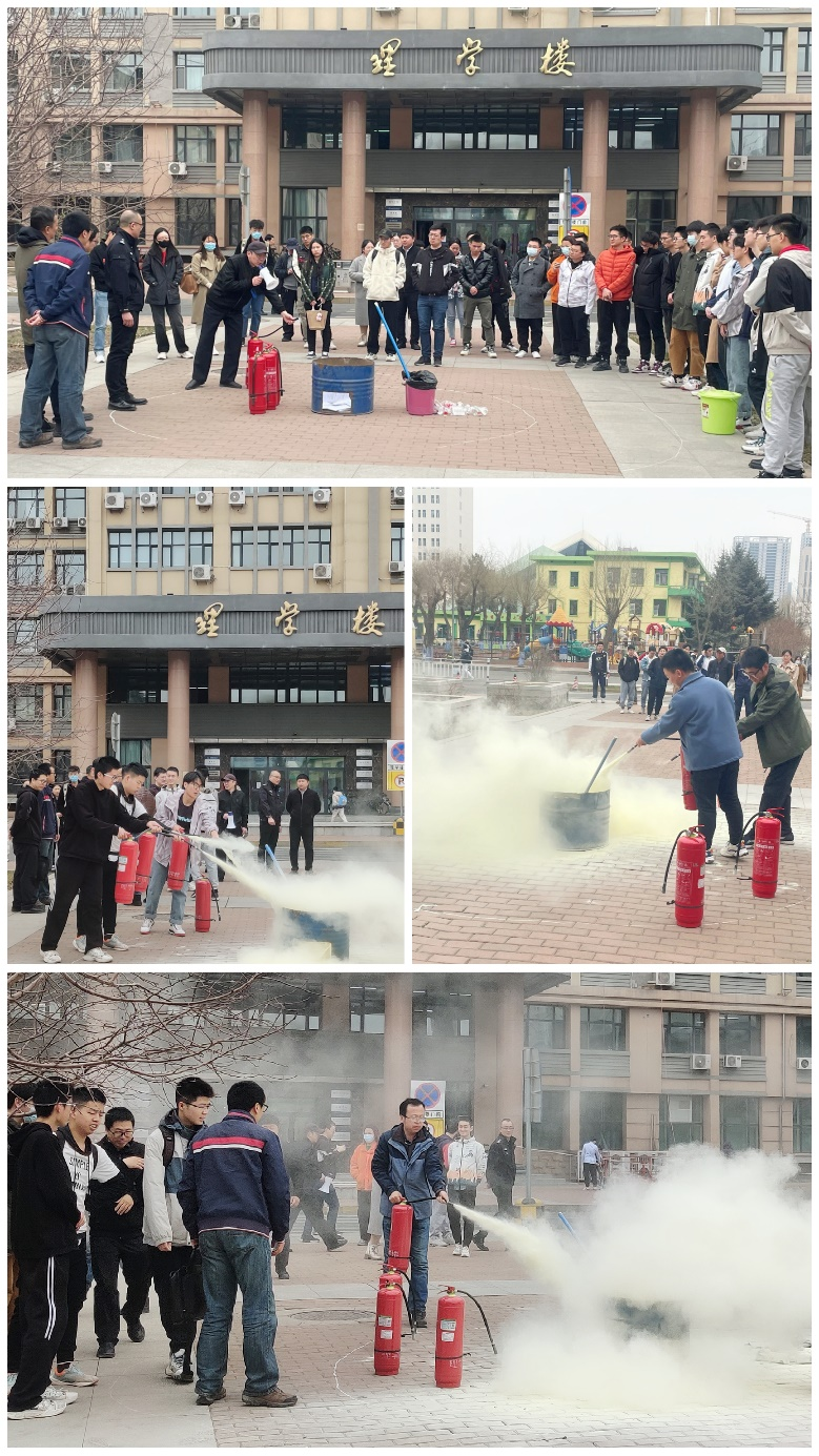 理论学习后,王继刚工程师在理学楼前花园广场对于常用灭火器材的使用方法进行了实践教学,并现场组织了消防实操模拟演练。