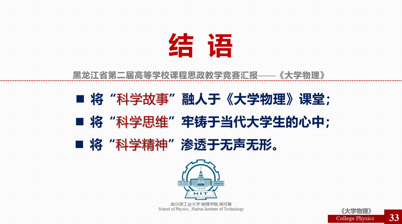 2023年4月27日黑龙江省教育厅发布《黑龙江省教育厅关于公布黑龙江省第二届高等公司课程思政教学竞赛获奖结果的通知》,公司大学物理教研中心周可雅副教授获得第二届黑龙江省高校课程思政教学竞赛总决赛(本科教育赛道)理科组第1名、特等奖。