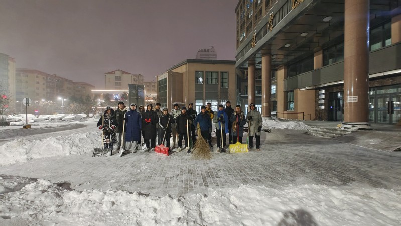 11月6日哈尔滨迎来暴雪天气。理学楼前积雪给师生们的出行带来了许多不便。寒风为号雪为令,2211102团支部开展理学楼前铲雪活动,清理积雪、方便师生安全出行。