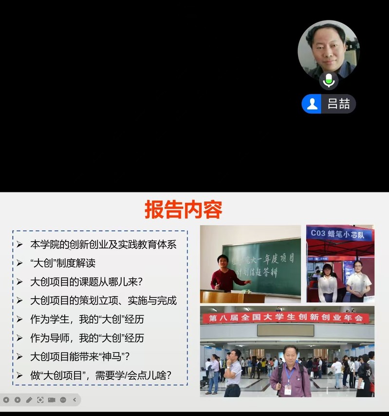 随后,吕老师根据大创作品成果的前景,提出应将大创计划与专业学科竞赛紧密结合,优秀的大创作品将有机会参加大创年会、互联网+、国际老员工创新创业大赛,可以极大地丰富同学们的知识储备、拓展视野,并讲解了专业学科竞赛的参赛技巧等。为了启发同学们的创新思维,吕老师向同学们展示了自己作为员工时参加大创的研究成果,也讲述了作为大创指导教师代领员工做大创项目的经历,引导同学们选择自己感兴趣的研究方向。