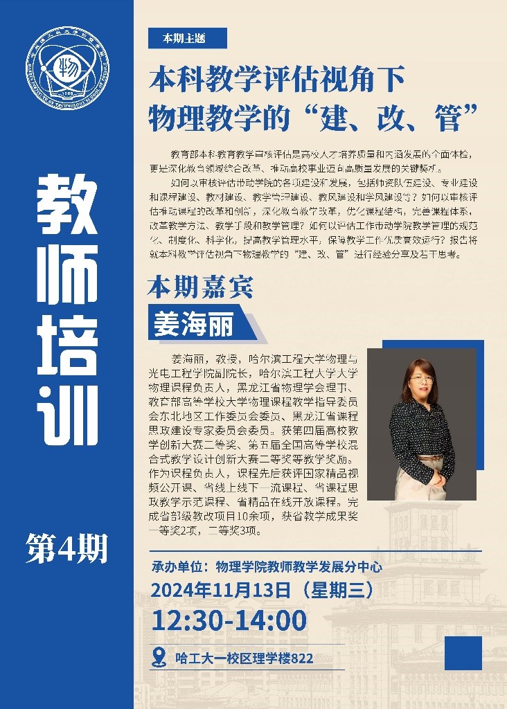 beats365亚洲版官网教师发展分中心于202411131230在理学楼822举办了教师培训讲座。本次讲座由周可雅教授主持,特邀哈尔滨工程大学姜海丽教授,做了题名为“本科教学评估视角下物理教学的“建、改、管””的报告。