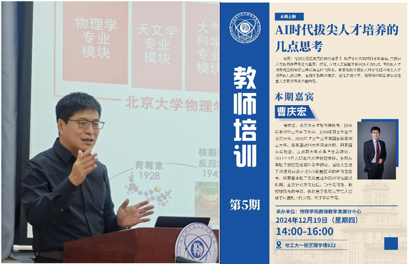beats365亚洲版官网教师发展分中心于2024年12月19日在理学楼822举办了一场主题为“《AI时代拔尖人才培养的几点思考》”的教师培训讲座。本次讲座由北京大学博雅特聘教授曹庆宏主讲,旨在探讨和分享在AI时代背景下,物理学拔尖人才培养的新思路和新方法。