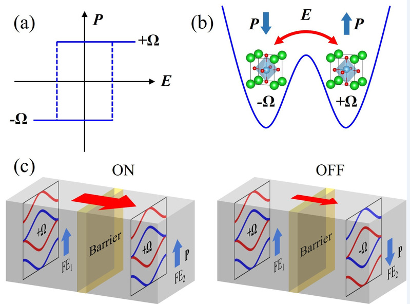 目前基于全电学操控的半导体自旋电子学器件非常稀少,最早提出的自旋场效应晶体管至今未能得到实验证明。基于此,研究团队提出了全新的铁电自旋轨道阀器件。在铁电半导体中,自旋轨道耦合的极性和铁电极化方向耦合在一起,因此自旋轨道耦合是非易失电学可控的,利用该特殊性质,研究团队创造性地提出了铁电自旋轨道阀器件,该结构由两层铁电层夹持一层超薄绝缘层材料。当两铁电层的极化方向平行时,电子隧穿几率较大,器件处于低电阻(ON)态。而当两铁电层的极化方向反平行时,电子隧穿几率较小,器件处于高电阻(OFF)态。基于理论模型和实际材料的第一性原理计算,发现器件电导有数量级的改变,实现了巨自旋轨道阀效应。本研究为未来设计新型半导体自旋电子学器件,提供了重要的理论基础和指导思路。